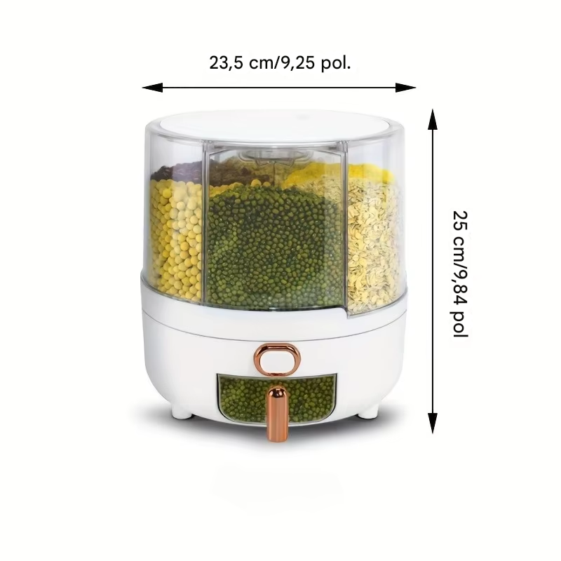 Com 6 compartimentos e estrutura compacta, otimiza o espaço da cozinha e mantém os alimentos sempre organizados e visíveis. O sistema giratório 360° facilita o acesso rápido a qualquer compartimento, enquanto o copo medidor ajuda no controle preciso das porções, evitando desperdícios.