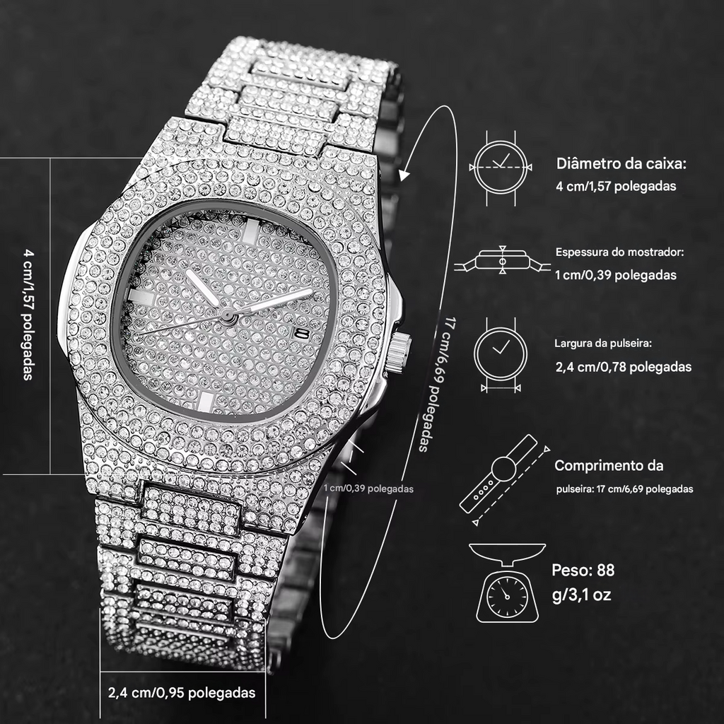 Fabricado com caixa e pulseira em aço inoxidável, oferece boa durabilidade e conforto. Possui movimento quartzo, garantindo precisão no horário. O mostrador sem números reforça o design minimalista e sofisticado.