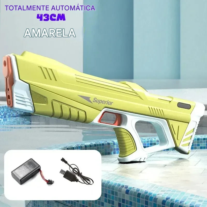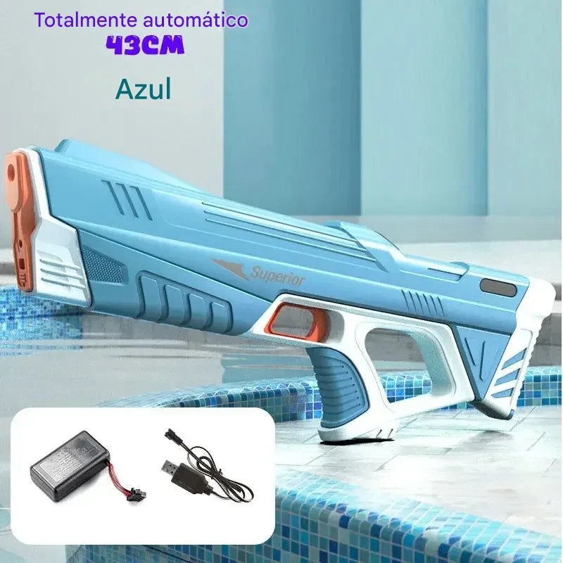 Pistola de água elétrica com alta pressão, ideal para brincadeiras ao ar livre no verão, piscina, quintal e jogos aquáticos. Possui sucção automática de água e funcionamento elétrico, garantindo jatos fortes e contínuos para mais diversão.